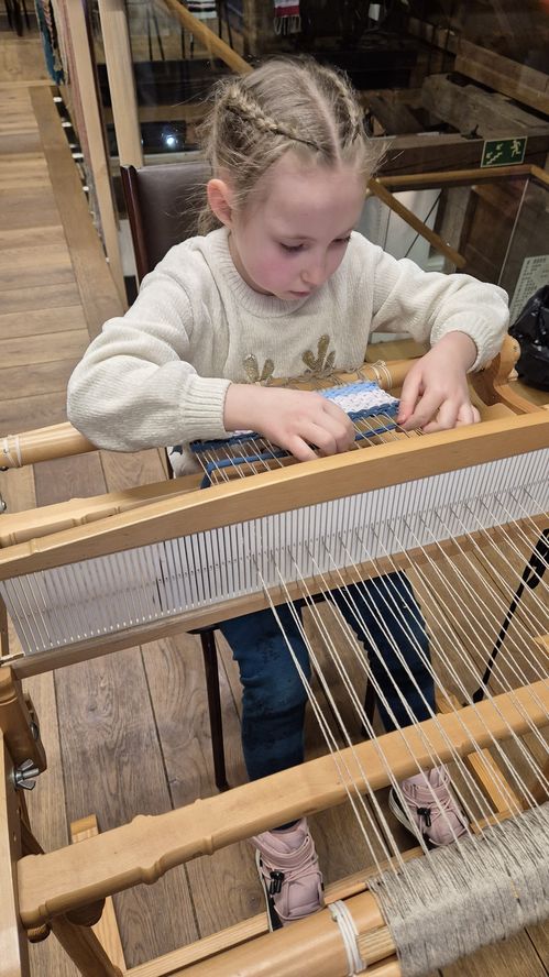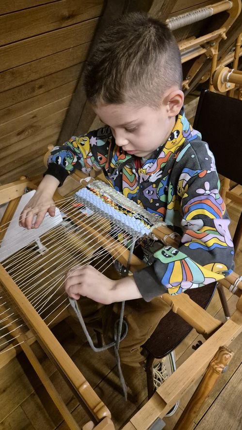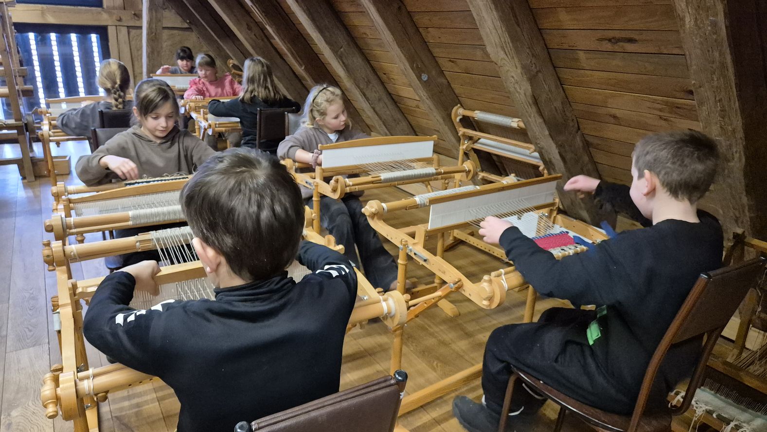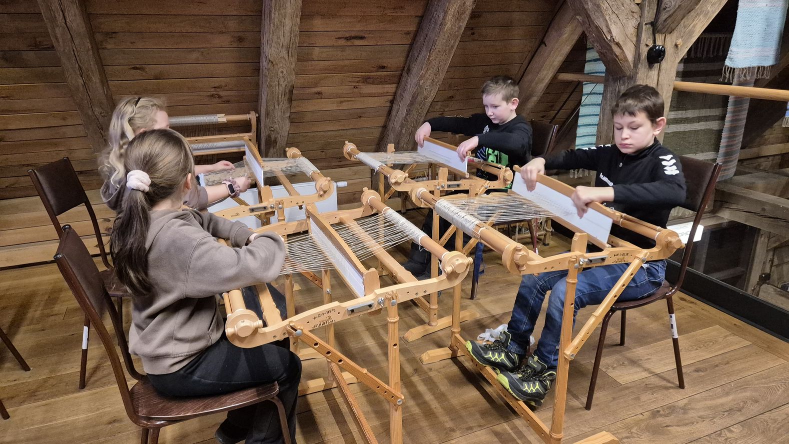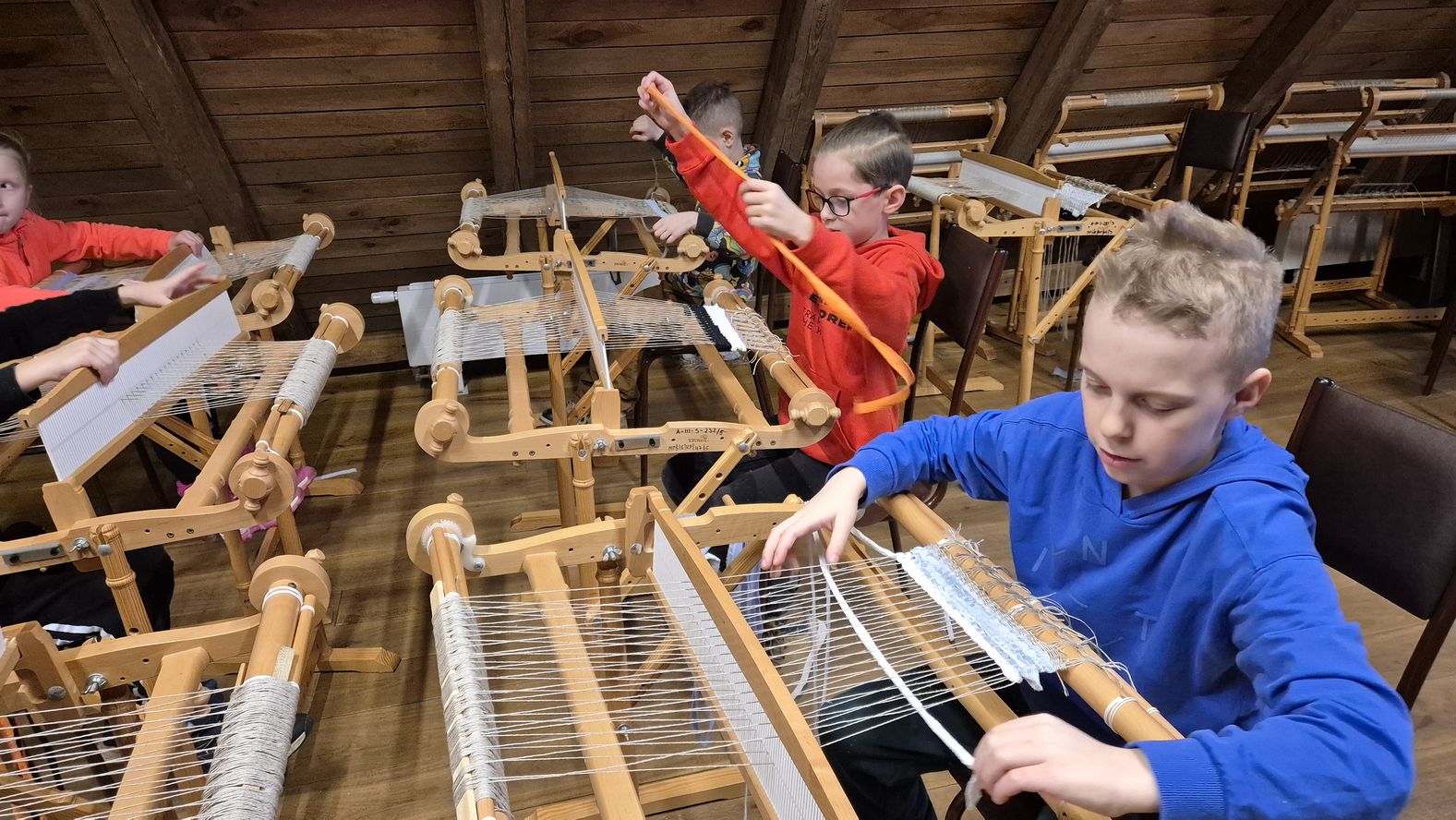 Ciekawym doświadczeniem były także warsztaty tkackie, podczas których uczniowie poznali podstawy tradycyjnego rzemiosła i mogli spróbować swoich sił w pracy na prostych krosnach.